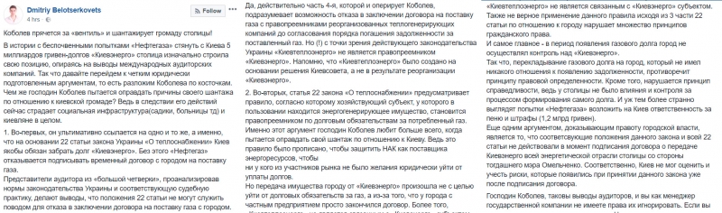 Нардеп упоминает выводы Очень Важных международных аудиторских компаний, но забывает добавить их названия и, собственно, выводы. Здесь начинается самое интересное: Белоцерковец открыто признает, что аудиторы не считают закон «О теплоснабжении» серьёзным аргументом в дискуссии. То есть, закон может обжаловать откровенно левый парень с поддержкой неизвестных аудиторов. Много внимания уделяется предназначению законопроекта, но там вместо анализа также расписаны личные обиды спикера.