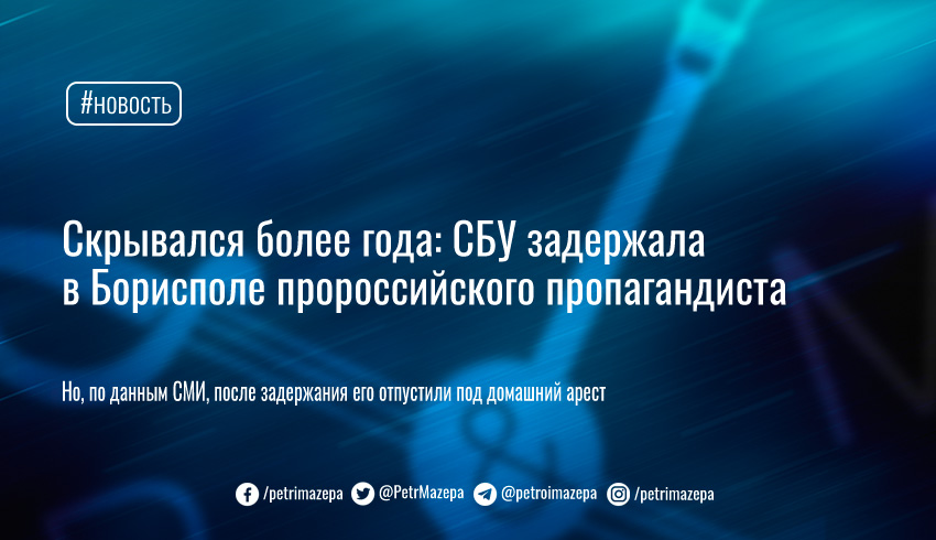 Служба безопасности Украины (СБУ) задержала в Борисполе пророссийского пропагандиста. Он является участником группы интернет-агитаторов, распространявших российскую пропаганду в Украине. Разоблачили пропагандиста летом 2020 года, но после объявления подозрения он бежал и скрывался от следствия.