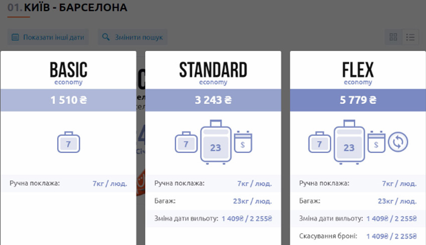 Минимальные цены на перелет у первого украинского лоукостера такие – Попрад от 987 грн, Тбилиси, София или Барселона от 1508 грн за перелет в одну сторону. Билеты предлагаются по трем тарифам. Самый простой Basic не предполагает багаж, включает перевозку только ручной клади не более чем на 7 кг, не подлежит обмену и возврату. Тариф Standart позволяет провозить до 23 кг багажа вместе с ручной кладью, и обменять билет с выплатой штрафа. Flex включает также возможность отмены билета после выплаты штрафа, сообщает Avianews.