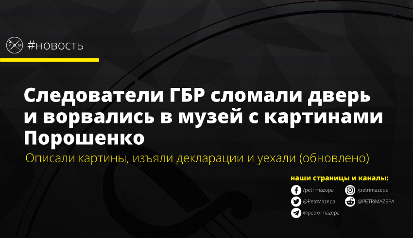 • Позже следователи ГБР постарались ворваться в музей, несмотря на слова директора о том, что музей сегодня закрыт, а решения суда предоставлено не было. Позже сотрудники ГБР отметили, что пришли для вручения повесток Петру Порошенко по двум делам, правда отказались сообщать на камеру, по каким именно.