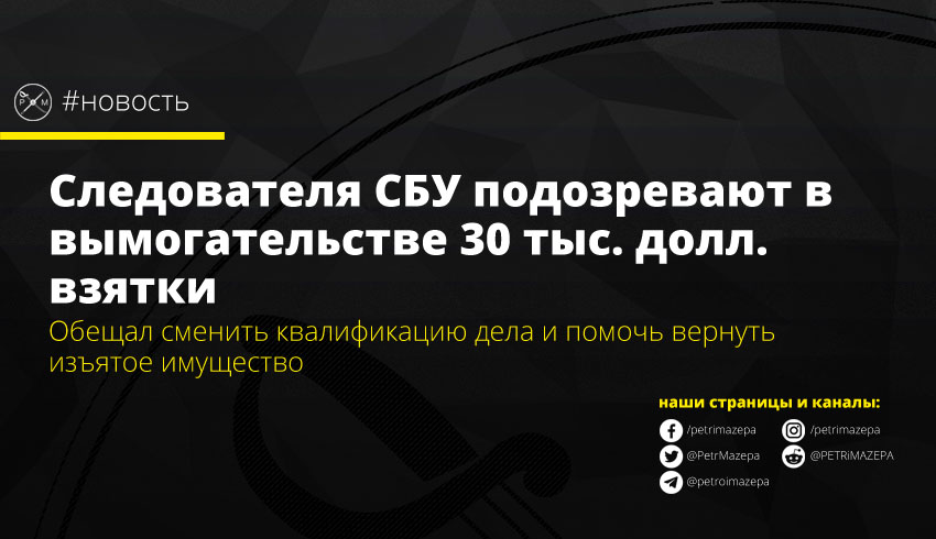 Офис генпрокурора совместно с ГБР и управлением внутренней безопасности СБУ сообщили о подозрении следователю Управления СБУ в Донецкой и Луганской областях. По данным следствия, он требовал у подозреваемого 30 тысяч долларов, за что обещал помочь с переквалификацией дела, соглашением о признании вины и возвращением изъятого имущества.