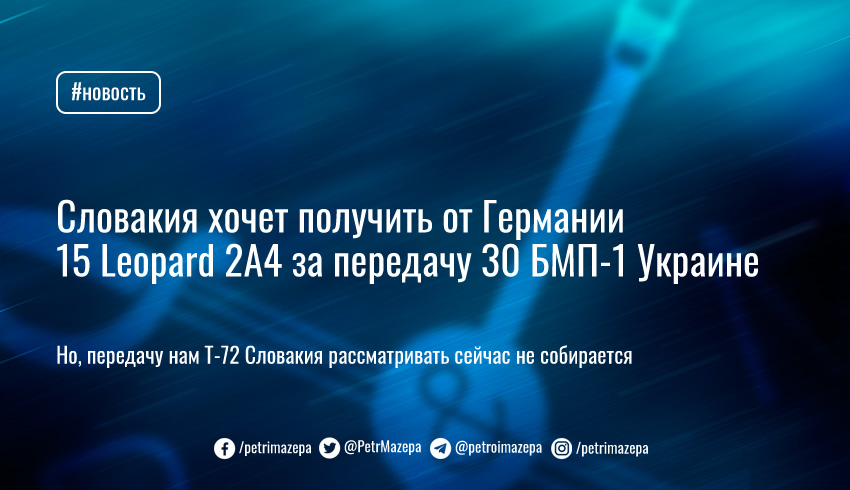 Словакия планирует в ближайшее передать Украине 30 боевых машин пехоты БМП-1. А взамен планирует получить от Германии 15 танков Leopard 2A4. Но министр обороны страны уточнил, что на данный момент отправка в Украину еще и имеющихся у Словакии танков Т-72 не рассматривается.