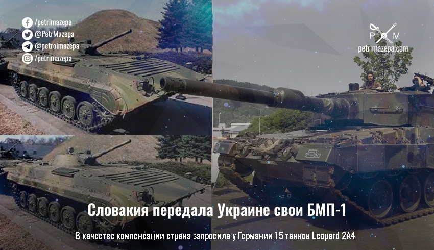 Министр обороны Словакии Ярослав Надь сообщил, что его государство передало Украине 30 боевых машин пехоты БМП-1. Ранее сообщалось, что в качестве компенсации страна запросила у Германии 15 танков Leopard 2A4.
