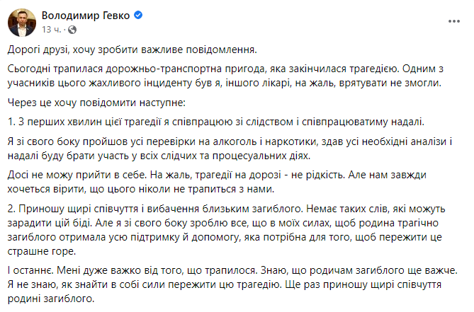 Согласно освидетельствованию на устройстве «Драгер» Гевко был трезвым. В настоящее время решается вопрос о возбуждении уголовного производства, предусмотренного ч. 2 ст. 286 УК Украины (Нарушение правил безопасности дорожного движения или эксплуатации транспорта лицами, повлекшее смерть потерпевшего).