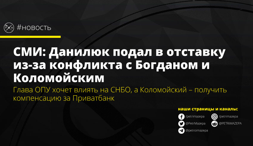 Секретарь СНБО Александр Данилюк подал заявление об отставке из-за конфликта с главой ОПУ Андреем Богданом. Второй причиной отставки СМИ называют желание Коломойского влиять на политику и получить компенсацию за Приватбанк.