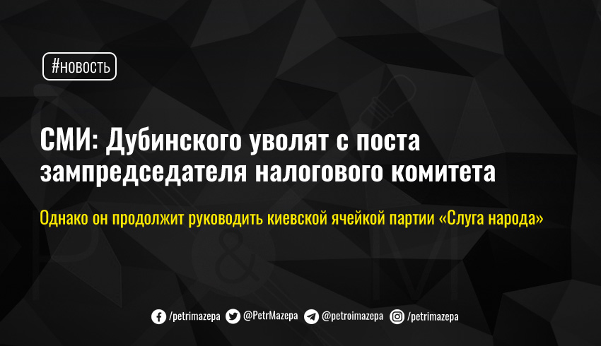 О снятии Дубинского с должности зампредседателя налогового комитета сообщает «5 канал» со ссылкой но свои источники. Однако оснований для того, чтобы он не руководил ячейкой «Слуги народа» в партии не видят.