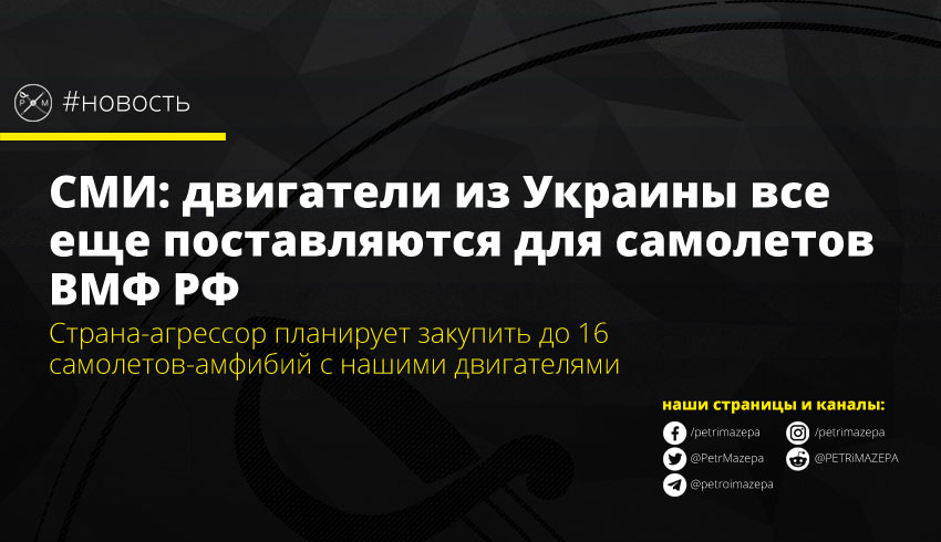 Военно-морской флот РФ продолжает получать украинские двигатели для самолетов-амфибий Бе-200ЧС, сообщает «Національний Промисловий Портал». По данным издания, турбореактивные двигатели направляются из Украины на ПАО «Таганрогский авиационный научно-технический комплекс имени Г. М. Бериева», где проводится сборка самолетов для морской авиации ВМФ страны-агрессора.