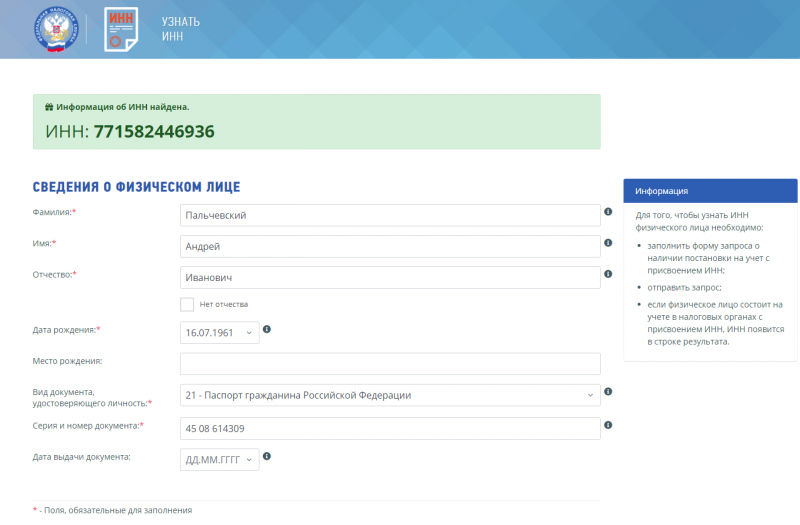 При поиске на сайте ФНС РФ действительно можно узнать ИНН по данным паспорта, указанного как паспорт Пальчевского.