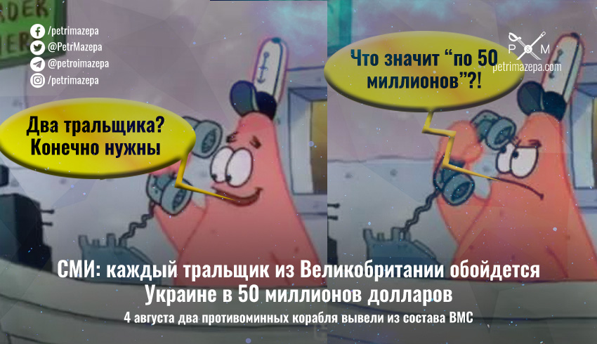 По данным «Думской», «каждый тральщик обойдется Украине примерно в 50 миллионов долларов». Такую уйму денег нужно будет потратить на обследование, ремонт, модернизацию, дополнительное оснащение, обучение и подготовку экипажей ВМС Украины.