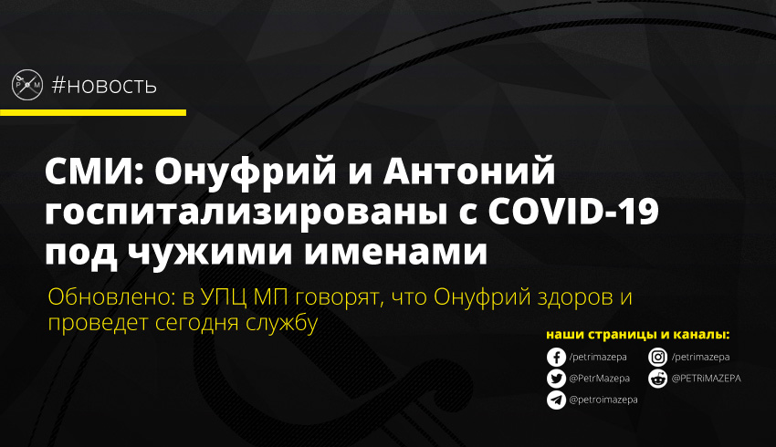 По данным «Религиозной правды» глава украинского филиала РПЦ митрополит Онуфрий заразился коронавируса и его тайно госпитализировали. Также коронавирус был обнаружен по данным издания у митрополита Антония из той же УПЦ МП.