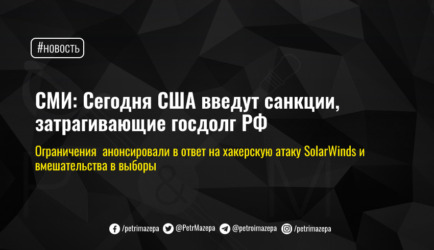 CNN со ссылкой на многочисленные источники, сообщает, что администрация Байдена объявит санкции против физических и юридических лиц в РФ. Вloomberg уточняет, что США выдворит 10 российских дипломатов из США и введет ограничения против 20 российских организаций в ответ на хакерскую атаку против SolarWinds и вмешательства в выборы. По данным New York Times новый пакет антироссийских санкций, о которых может быть объявлено в четверг, должен коснуться суверенного долга РФ.