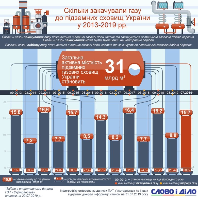 «Слово і Діло» посмотрело, сколько голубого топлива закачивали в хранилища Украины в 2013-2019 годах. Учитывая, что базовый сезон закачки газа начинается с первых газовых суток апреля и заканчивается в последние газовые сутки сентября, журналисты создали инфографику, которая показывает как обстояли дела с заполненностью хранилищ перед началом базового отбора газа (начинается в октябре) и в конце (заканчивается в марте).