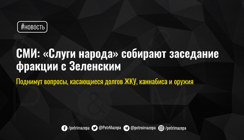 УНН со ссылкой на собственный источник сообщает, что на заедании ожидается появление и президента Украины Владимира Зеленского. «Слуги народа» обсудят законопроекты о легализации медицинского каннабиса (№ 4553-1), о разрешении на огнестрельное оружие (№4335), а также законопроект, которым, среди прочего, вводятся ограничения в отношении должников по оплате за жилищно-коммунальные услуги, подобные мерам в отношении должников-алиментщиков (№3613).