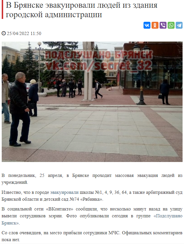 «В понедельник, 25 апреля, в Брянске проходит массовая эвакуация людей из учреждений. Известно, что в городе эвакуировали школы №1, 4, 9, 36, 64, а также арбитражный суд Брянской области и детский сад №74 “Рябинка”», — пишет издание. — «Со слов очевидцев, на место прибыли сотрудники МЧС. Официальных комментариев пока нет».