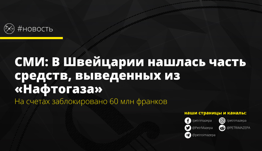 Федеральная прокуратура Швейцарии расследует дело о хищениях в «Нафтогазе». Есть основания полагать, что в рамках расследования, была обнаружена часть средств, незаконно выведенных из Украины бывшим руководством госкомпании. По состоянию на сегодня, в рамках уголовного производства на счетах в швейцарских банках заблокировали 60 миллионов франков.