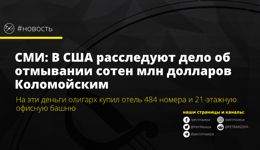 Об этом сообщило издание BuzzFeedNews со ссылкой на два источника. Отмечается, что в ходе расследования удалось отследить перевод денег из украинского банка в США через ряд офшорных компаний, после чего за эти средства приобреталась недвижимость в США, в том числе роскошный отель на 484 номера в Кливленде с видом на озеро и 21-этажная офисная башня в нескольких кварталах со сводчатыми потолками и фресками. Сам олигарх сообщил, что не знает ничего о расследовании, а любая нехватка средств в ПриватБанке, в которой его обвиняют регуляторы, «создана намеренно, чтобы экспроприировать банк, мою частную собственность». Кроме того, по его словам, он не нарушал законы и с ним никто не контактировал из Минюста США.