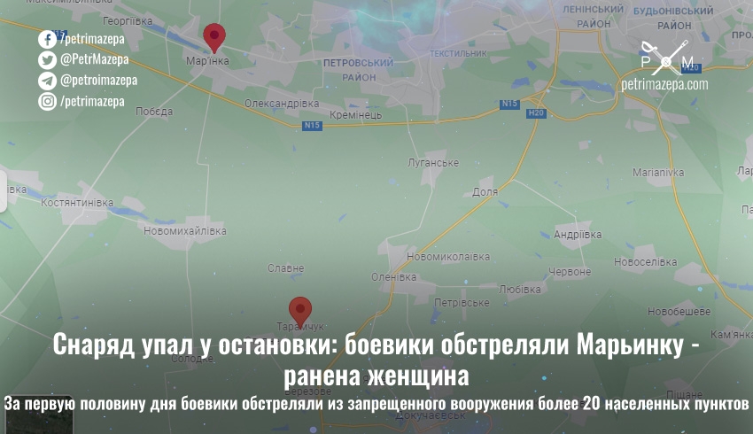 По данным штаба Объединенных Сил, обстрел Марьинки боевики осуществили из 120-мм минометов. Всего за утро под обстрелы из запрещенного Минскими договоренностями вооружения попали более 20 населенных пунктов.