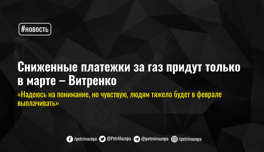 И.о. министра энергетики Юрий Витренко сообщил, что сниженные платежки за газ придут только начиная с марта. При этом по его же словам, если бы правительство ничего не сделало, то в марте платежки наоборот бы выросли, примерно на 25%.