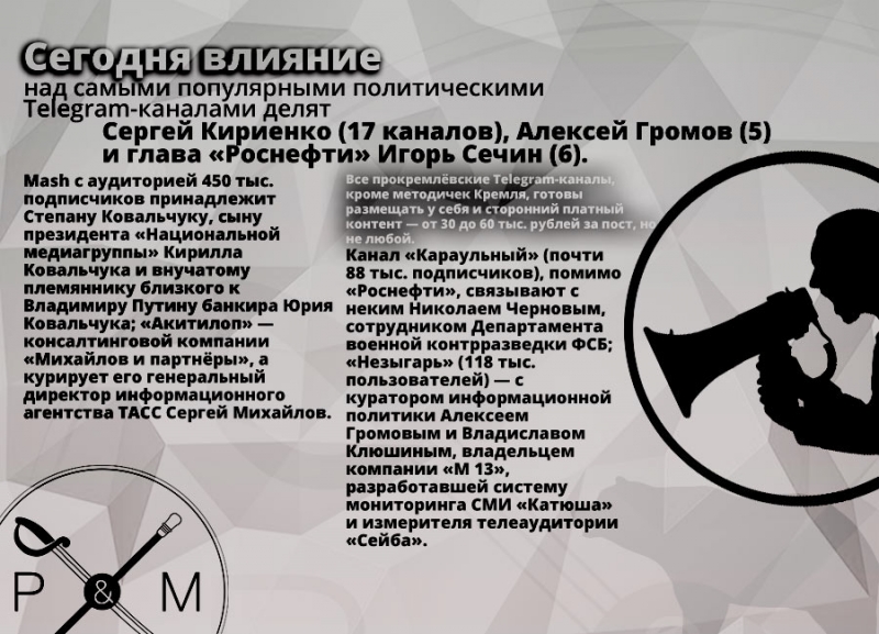 Сегодня влияние над самыми популярными политическими Telegram-каналами делят Сергей Кириенко (17 каналов), Алексей Громов (5) и глава «Роснефти» Игорь Сечин (6). Mash с аудиторией 450 тыс. подписчиков принадлежит Степану Ковальчуку, сыну президента «Национальной медиагруппы» Кирилла Ковальчука и внучатому племяннику близкого к Владимиру Путину банкира Юрия Ковальчука; «Акитилоп» — консалтинговой компании «Михайлов и партнёры», а курирует его генеральный директор информационного агентства ТАСС Сергей Михайлов.