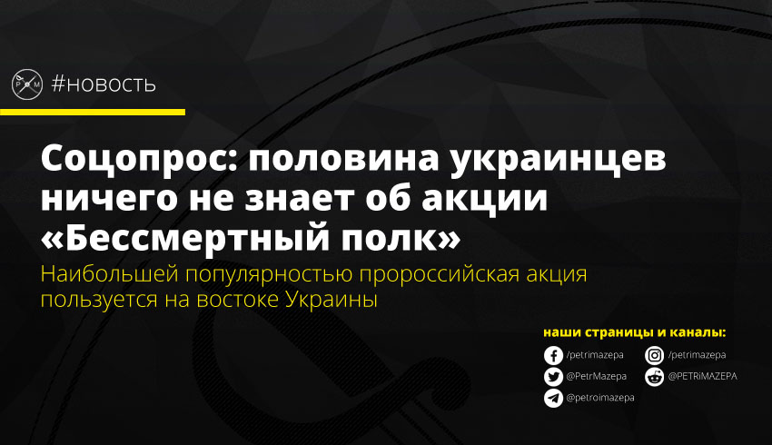 Более половины украинцев не знают про пророссийскую акцию «Бессмертный полк», которую и в стране-агрессоре, и благодаря пророссийским деятелям даже в Украине регулярно проводят 9 мая. При этом из тех, кто знает негативно к акции относятся 12%, столько же нейтрально, а знают и одобряют это действо всего 18% украинцев.