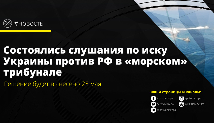 В Гамбурге состоялись слушания Международного трибунала по морскому праву, который рассматривал иск Украины против РФ по делу о незаконном задержании 24 моряков в прошлом году. Россия от участия в слушаниях отказалась. Решение ожидается 25 мая.