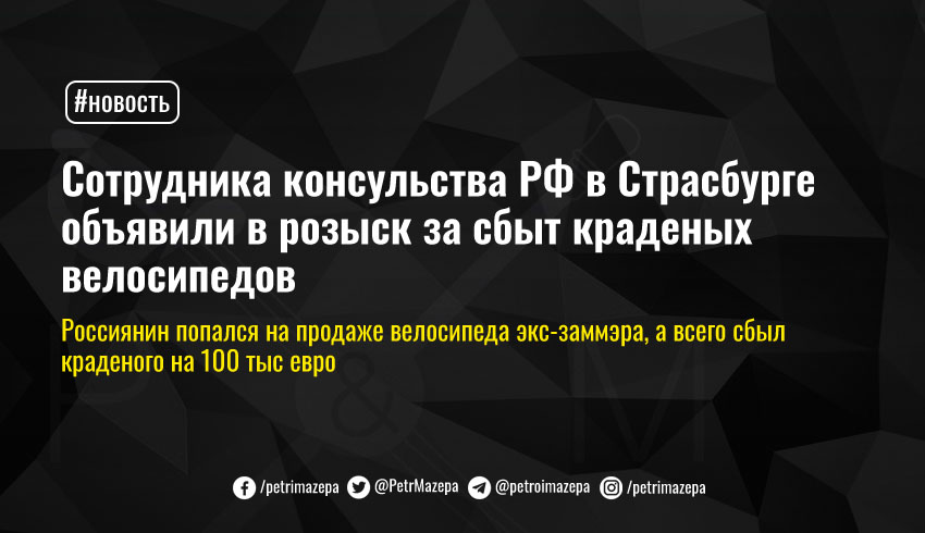 Сотрудника консульства РФ в Страсбурге объявили в розыск за сбыт краденых велосипедов