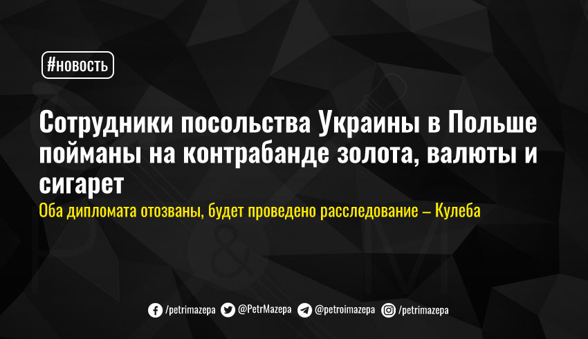 «Вчера двух сотрудников посольства Украины в Польше поймали на горячем - их задержали на границе при попытке вывезти на служебном авто из Украины в Польшу большое количество валюты, золота и контрабандных сигарет. Случай для МИД вопиющий», - рассказал Кулеба в Facebook.