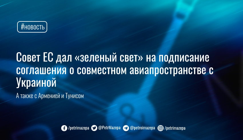 «Сегодня Совет ЕС дал "зеленый свет" для подписания трех соседских соглашений в сфере авиации - с Украиной, Арменией и Тунисом, а также соглашения о воздушном транспорте с Катаром. Эти соглашения откроют рынок воздушного транспорта и предоставят новые возможности для операторов и клиентов, способствующие торговле, туризму, инвестициям, экономическому и социальному развитию», - говорится в релизе ЕС.