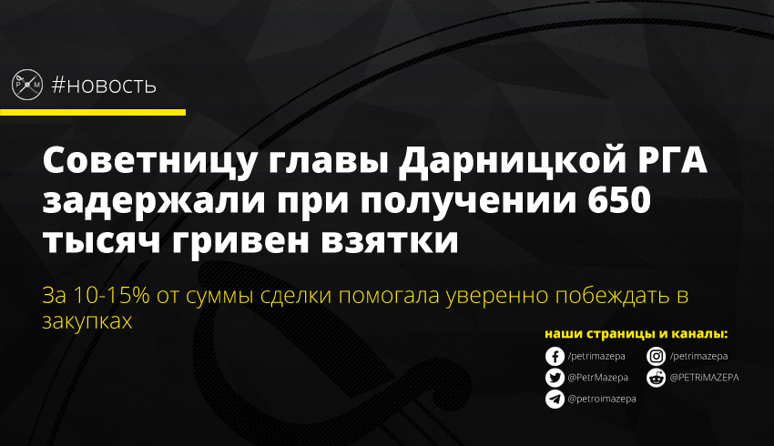 Вчера, 19 июля, при передаче 650 тысяч гривен взятки были задержаны советница главы Дарницкой РГА и передававший деньги человек. Следствие установило, что задержанная чиновница в сговоре с другими должностными лицами РГА, создала коррупционную схему получения неправомерной выгоды от субъектов предпринимательской деятельности. Прайс на победу в закупках составлял 10-15% от суммы сделки.