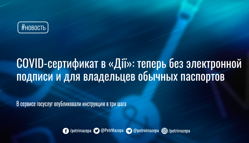 В сервисе госуслуг «Дія» сообщили, что генерировать СOVID-сертификат теперь можно не только без электронной подписи (например, «Дія.Підпис»), но и с паспортом-книжечкой прямо в ​​приложении.
