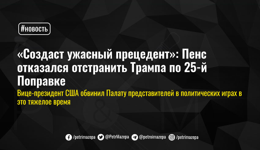 Вице-президент США Майкл Пенс отказался отстранить президента США Дональда Трампа от должности на основании 25-й поправки к Конституции, и заявил, что не намерен уступать, позволяя Палате представителей играть в политические игры в тяжелое для страны время.
