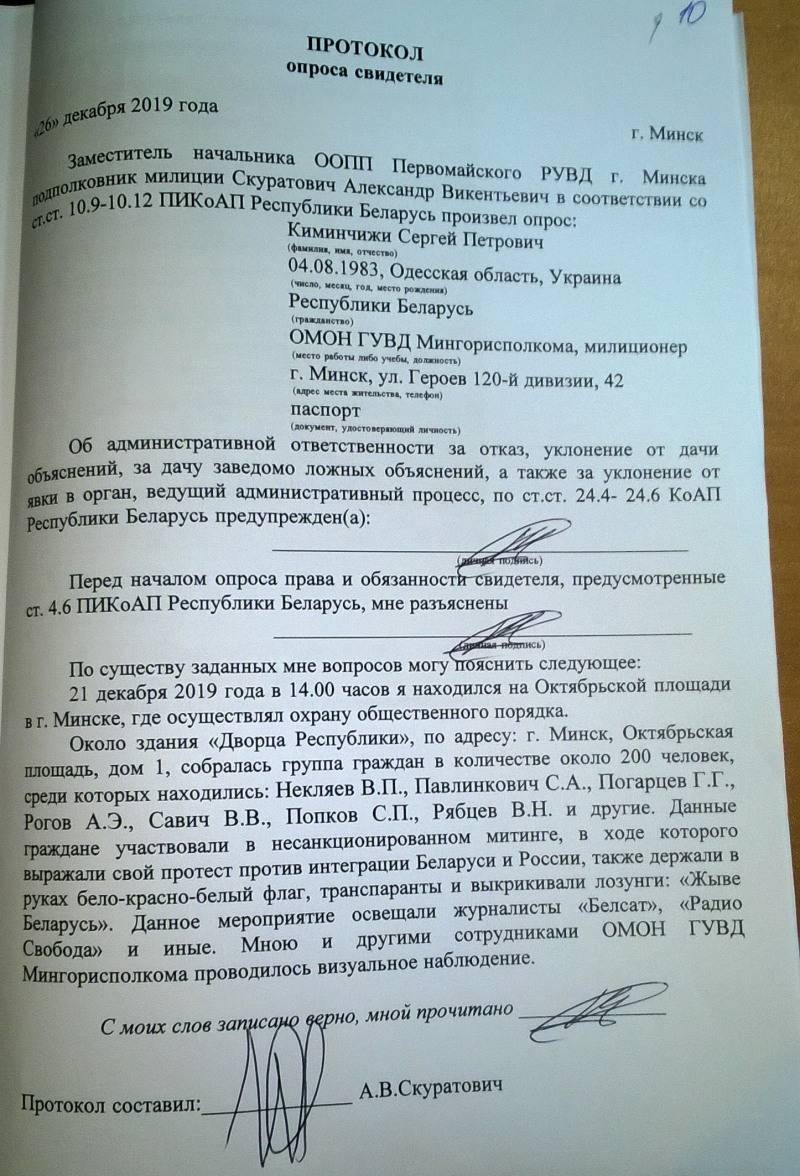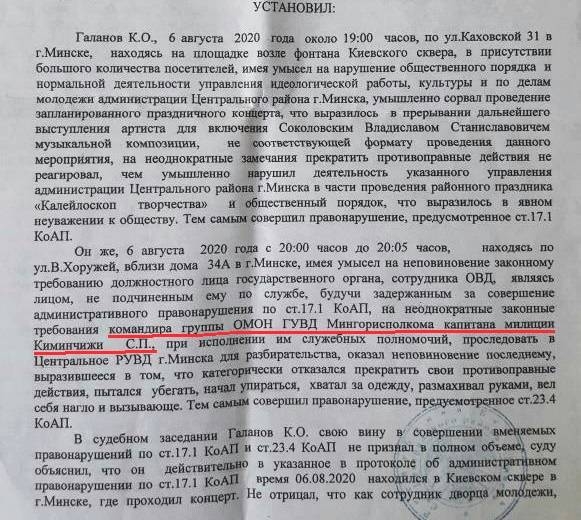 Постановление об административном правонарушении №6-2342/2343/2020 в отношении Кирилла Галанова не только дополнительно подтверждает факт службы экс-беркутовца Сергея Киминчижи в минском ОМОНе, но также содержит сведения о его должности и звании.