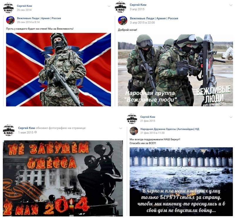 Свет на это поможет пролить его аккаунт в социальной сети «ВК», просто перенасыщенный информационными продуктами российской пропаганды. Киминчижи активно репостит не только из группы «Антимайдан», но и из коллаборционистских пабликов, созданных в рамках гибридной войны России против Украины: «Комитет освобождения Одессы — Антимайдан», «Народная Дружина Одессы (Антимайдан) НД», «Вежливые люди, Армия, Россия».