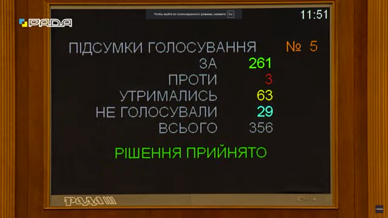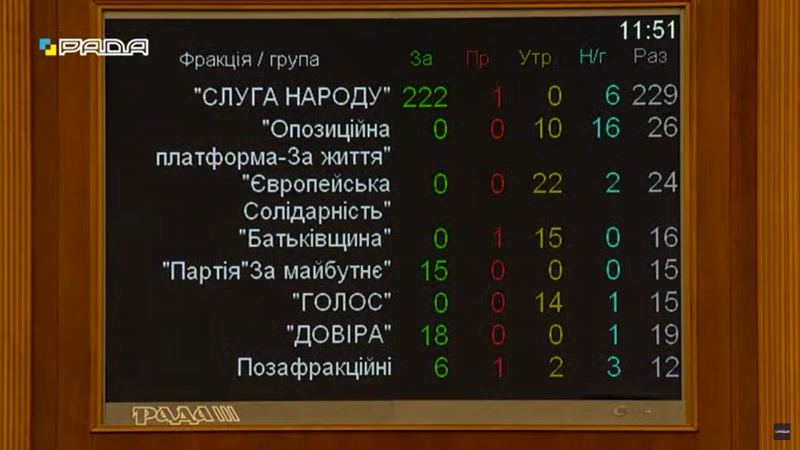 Всего это поддежали 261 нардеп, против проголосовали только 3 депутата, один от «Слуги народа», один от «Батьківщини» и один внефракционный депутат.