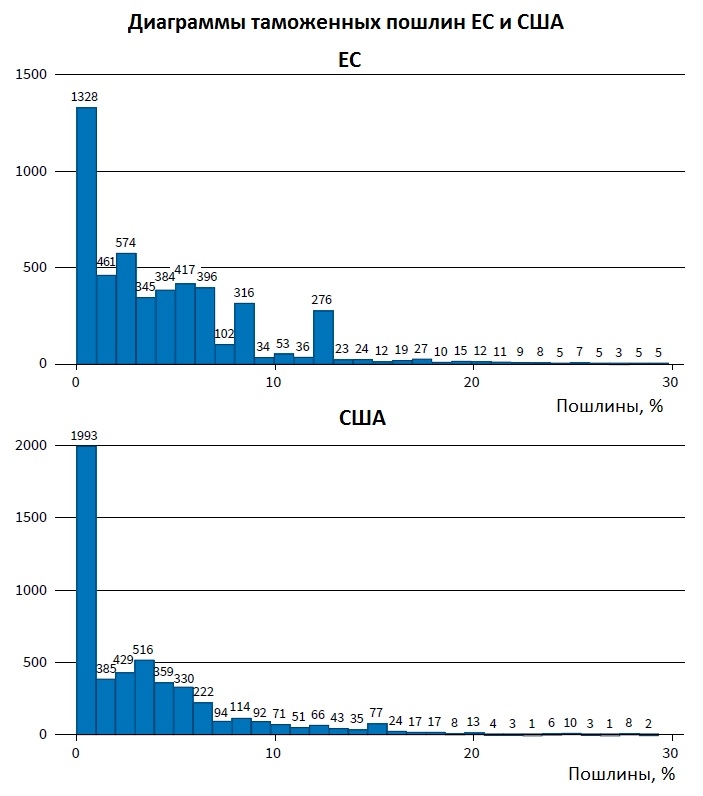 У 660 наименований американских товаров европейские пошлины составляют минимум 10%, в 96 случаях — минимум 30%. В США соответственно на 472 наименования европейских товаров и 24.