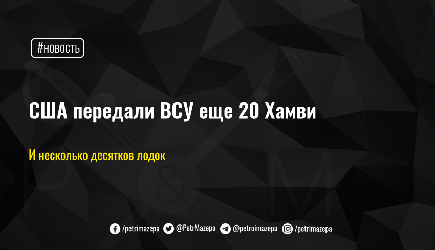 Посольство США в Украине сообщило, что в рамках помощи Сухопутным войскам Украины и Силам специальных операций было передано еще 20 автомобилей HMMWV. А Военно-морские силы Украины получили 84 лодки.
