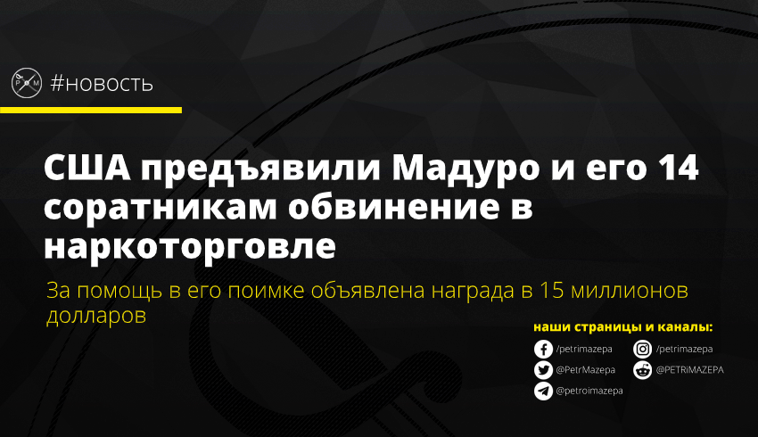 Президенту Венесуэлы Николасу Мадуро и его 14 соратникам власти США предъявили обвинения в контрабанде наркотиков. Мадуро грозит срок лишения свободы минимум на 50 лет.