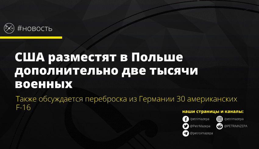 Польские СМИ сообщают, что США увеличат свое присутствие в стране не на тысячу военных, как предполагалось ранее, а на две тысячи. Также идет диалог о переброске в Польшу из Германии около 30 американских F-16. Военные будут размещены на специальных правах.