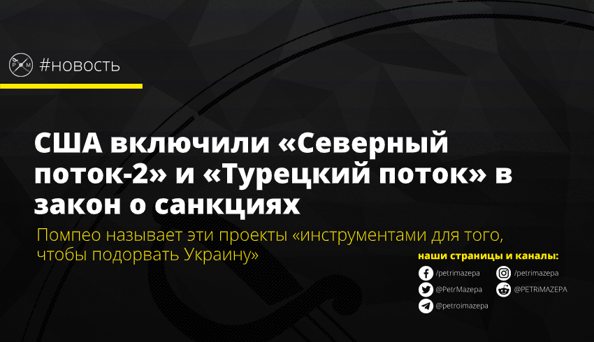 Об этом заявил госсекретарь США Майкл Помпео, пишет Укринформ. «Сегодня Государственный департамент обновил полномочия в рамках закона CAATSA, включив в него проекты "Северный поток - 2" и вторую нитку "Турецкого потока". Это действие создает вероятность введения санкций США против инвестиций и других видов деятельности, связанной с российскими трубопроводами», - сказал Помпео.