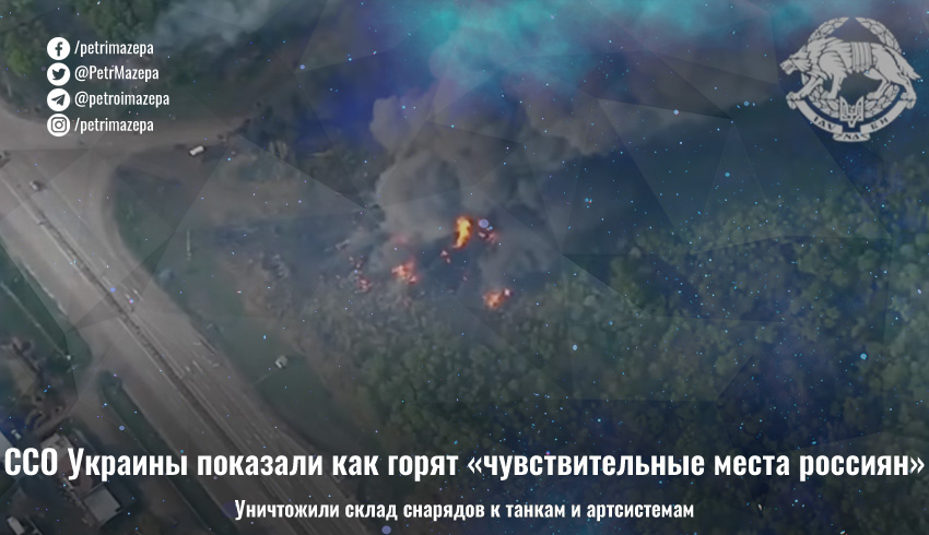 «ССО Украины бьют по чувствительным местам россиян. На днях в одном из районов выполнения задач наша группа обнаружила полевой состав боекомплекта русских оккупантов. Во время наблюдения за объектом было установлено наличие значительных запасов вражеских боеприпасов, в частности снарядов к танкам и артиллерийским системам разного калибра», — сообщается к подписи в видео.