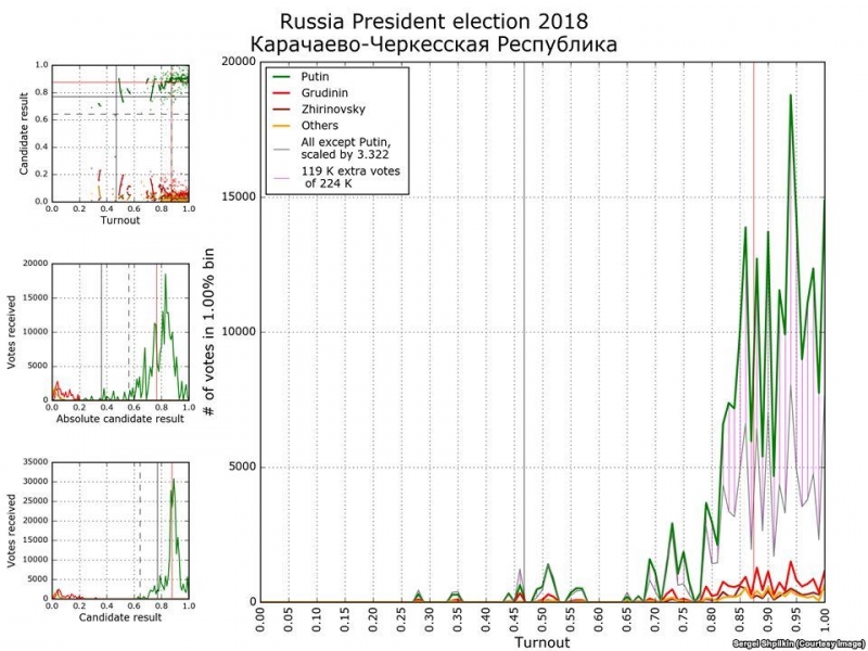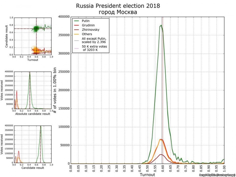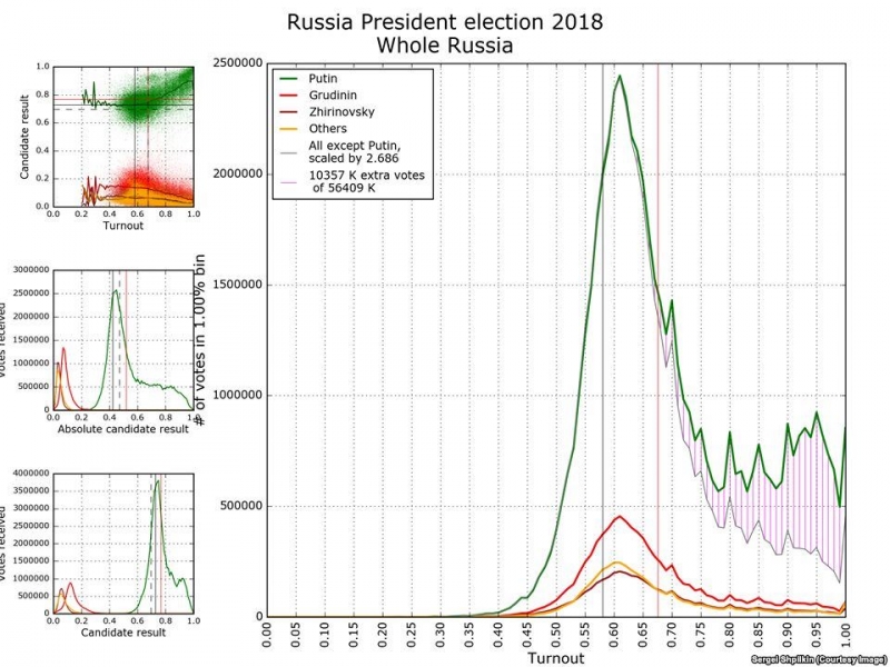 Один из наиболее активных экспертов в электоральной статистике, опубликовавший несколько научных статей об аномалиях на выборах в России, физик Сергей Шпилькин рассказал Радио Свобода, что в целом прошедшие в воскресенье выборы президента РФ оказались несколько «чище» большинства других за последние 15 лет, впрочем, за «главного кандидата» всё равно было вброшено порядка 10 миллионов бюллетеней.