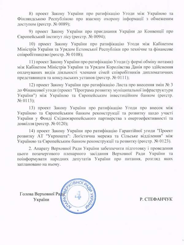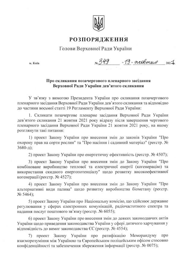 Спикер Верховной Рады Руслан Стефанчук созывает внеочередное заседание парламента на четверг, 21 октября. В повестке дня – 14 законопроектов, в том числе об энергоэффективности, о выработке биометана, детского питания, и о ратификации соглашений с Финляндией и Эстонией.