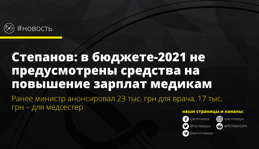 Министр здравоохранения Максим Степанов рассказал, что в проекте госбюджета на 2021 год не предусмотрено средств на повышение зарплат медикам, которого запрашивало министерство. Бюджетный запрос Минздрава не поддержали, а потому и сам Степанов воздержался при голосовании за проект бюджета на заседании Кабмина.