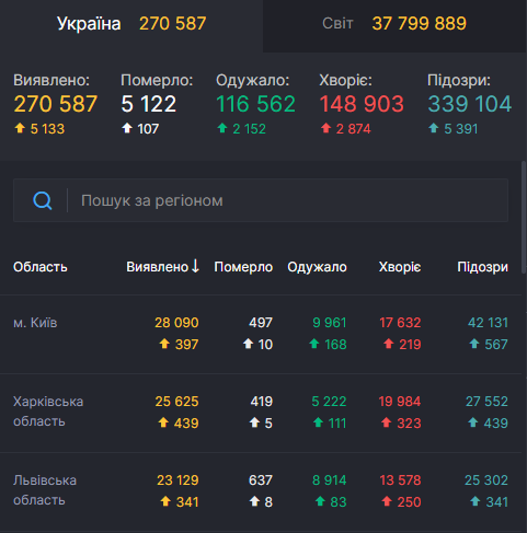 За сутки выздоровело 2 152 пациента (всего 116 562 с начала пандемии), а 107 – умерли от осложнений (всего 5 122). Согласно данным СНБО количество активных больных за понедельник выросло на 2 874 и достигло 148 903 больных.