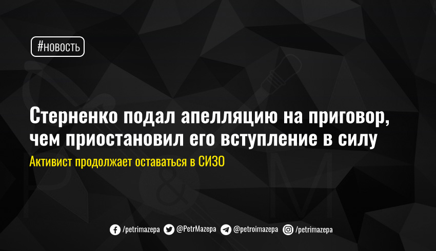 Активист Сергей Стерненко сообщил, что апелляция на приговор по делу о похищении Сергея Щербича уже подана. Таким образом вступление приговора в силу приостановлено. Сегодня по другому делу (о самозащите) рассматривалось изменение меры пресечения, но судья отказался изменять решение.