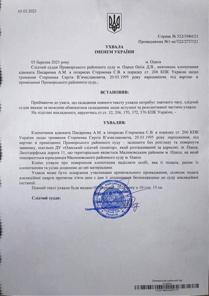 Также сегодня в Приморском райсуде Одессы состоялось очередное заседание про третье покушение на Стерненко. Адвокаты хотели добиться изменения меры пресечения, но судья оставил запрос без рассмотрения. Официальная причина – Стерненко содержится в Малиновском СИЗО, а не в Приморском, а потому судья не может рассматривать этот вопрос. Наличие во время рассмотрения самого Сергея Стерненко в зале Приморского райсуда судью нисколько не смутило.