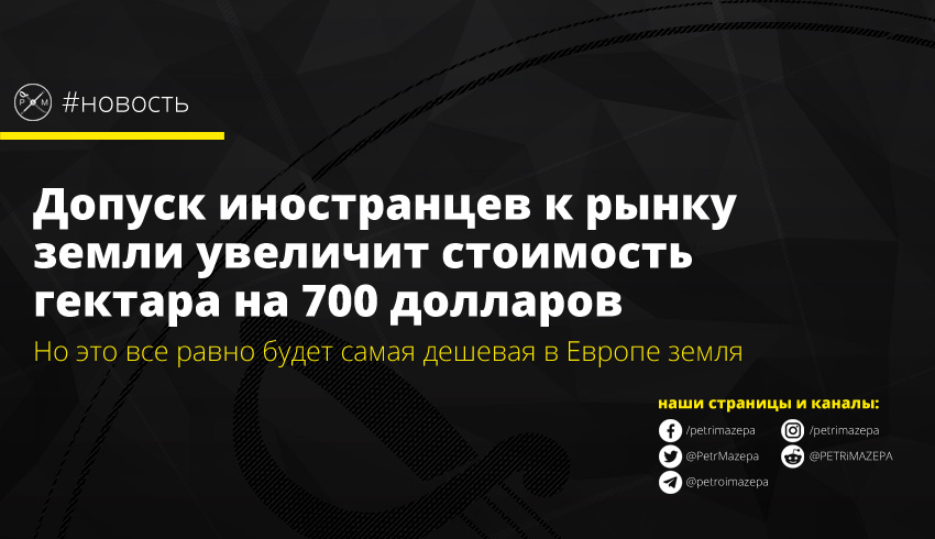 Заместитель министра экономики Тарас Высоцкий рассказал, что стоимость гектара земли зависит от того, будут ли к покупке допущены иностранцы, передает «НВ». Согласно имеющимся расчетам, цена гектара земли будет в среднем составлять 2200 долларов. При этом уточняется, что если исходить из ограниченной модели («только украинцы покупают») – то стоимость гектара земли будет установлена на уровне 1500 долларов.