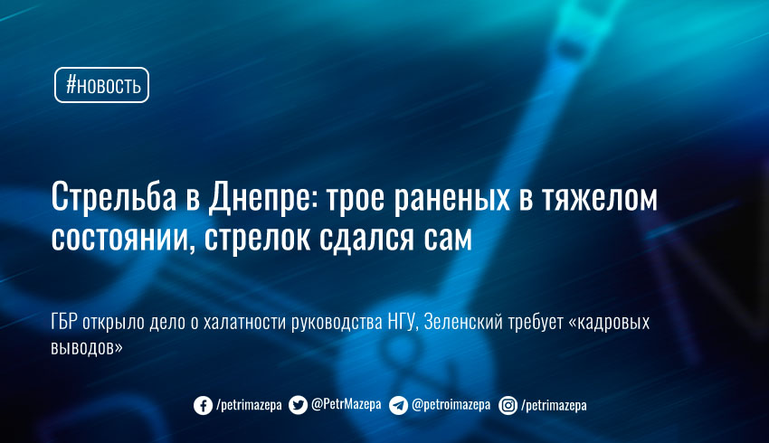 Трое пострадавших во время стрельбы на территории завода «Южмаш» находятся в тяжелом состоянии, в том числе 22-летняя девушка, в которую стреляли в упор. В ГБР сообщили, что стрелок сдался правоохранителям сам, а также об открытии дела по возможной служебной халатности руководства Нацгвардии. Кадровых выводов потребовал и президент Зеленский в своей реакции на трагедию.