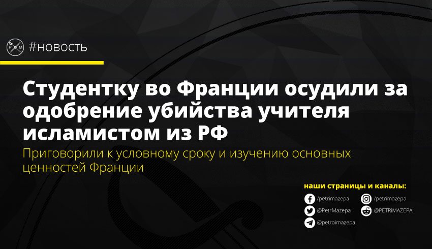 Суд во Франции приговорил к 4 месяцам условно 19-летнюю студентку за оправдание убийства учителя исламистом из РФ. Девушка в своем Facebook заявила, что жертва «заслужила смерть». Позже пост был удален, а на суде студентка заявляла, что опубликовала его «не подумав».