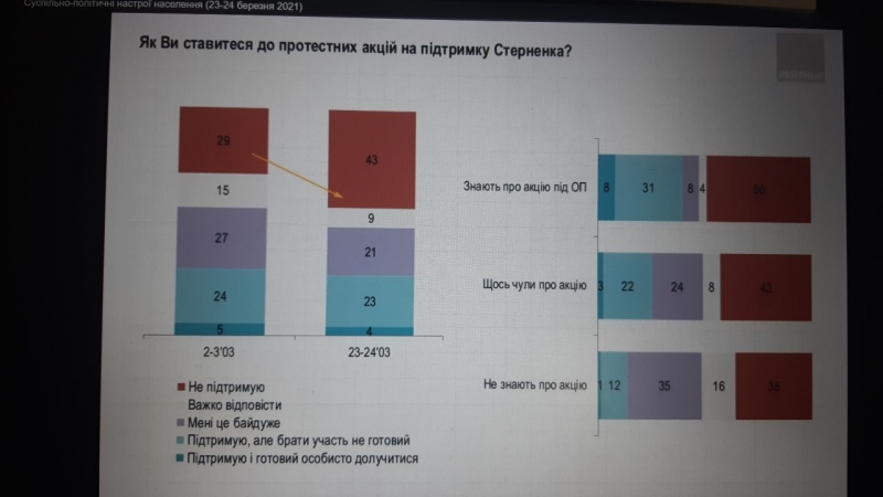 Важный нюанс для тех, кто ещё сомневается, что такое неприятие обществом акций в поддержку Стерненко – результат желания поиграть в субботнее граффити. Представляем вниманию следующий слайд исследования. И, если до последней протестной акции её проведение не поддерживали 29% отпрошенных, то после  уже 43%.